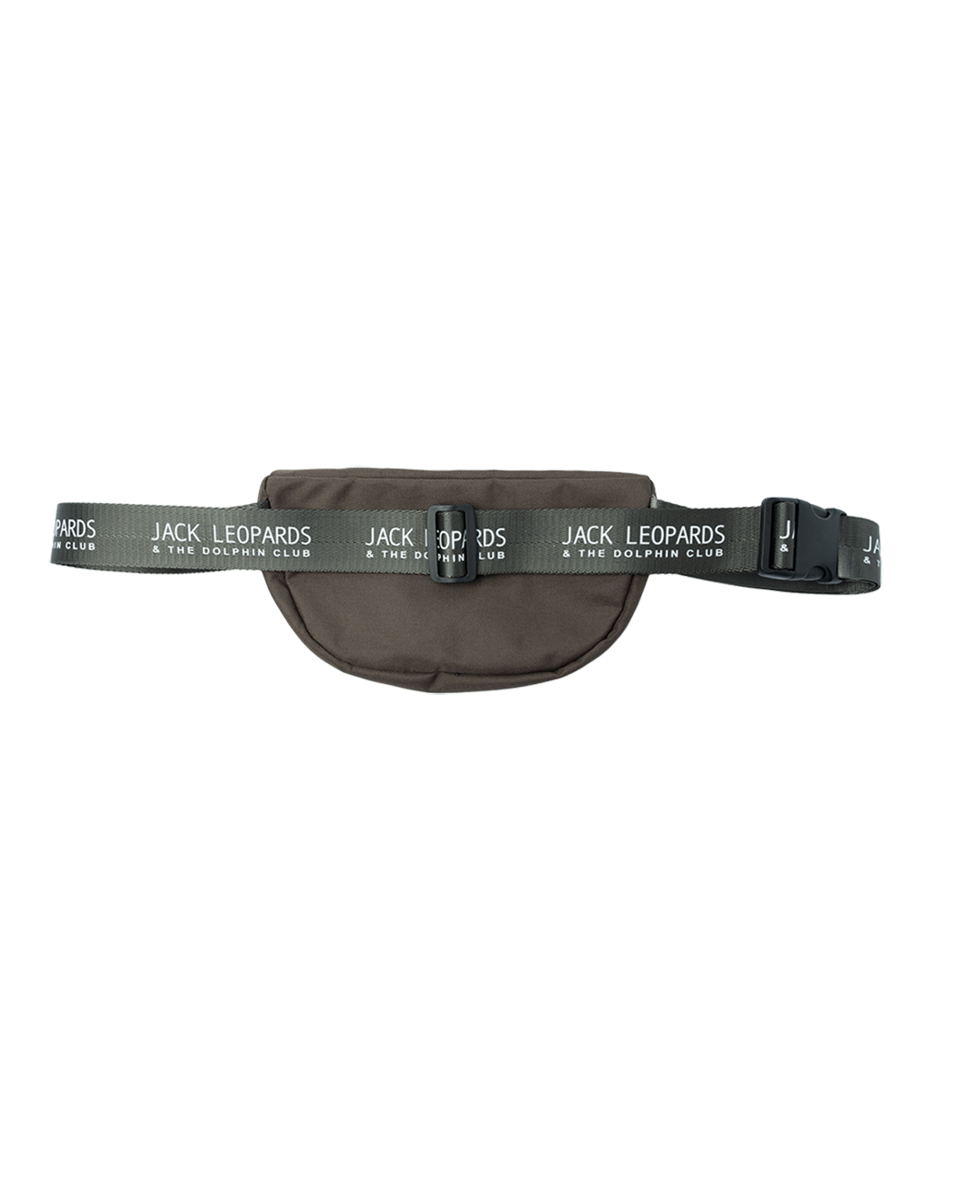 Brown zipper hip bag featuring Jack Leopards & The Dolphin Club embroidered on front woven label with Jack Leopards & The Dolphin Club repeating logo printed on adjustable strap with buckle closure.